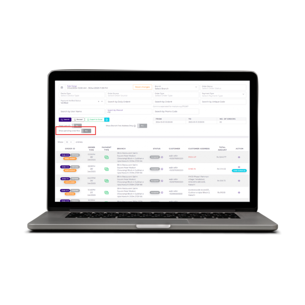 - Orders with pending status appear first.