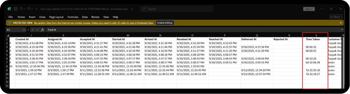 • Automatic calculation of end-to-end trip duration from order dispatch to delivery.
