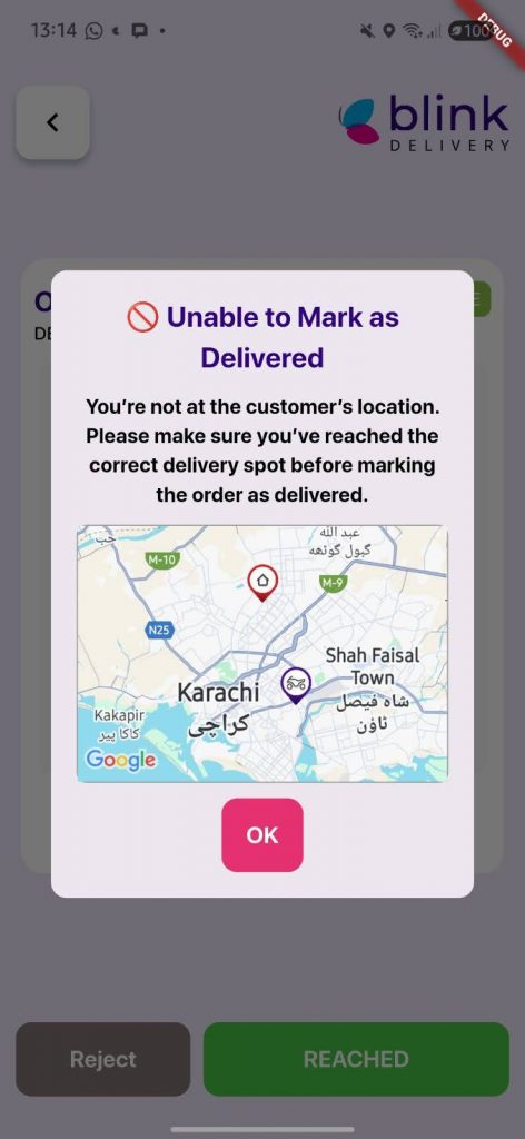 When a rider goes outside the delivery radius, the pop-up now displays a map showing both the rider and customer location markers. This provides visual context to help riders quickly understand their position and return within the allowed radius.