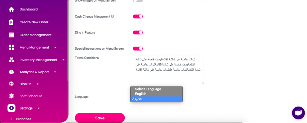 • Users can select Arabic as their preferred language within the POS system.